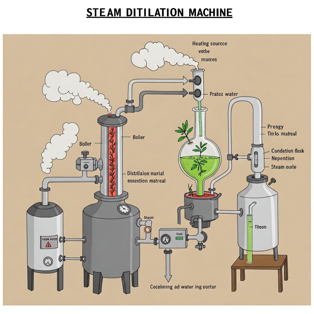 The process involves heating water in a boiler, which produces steam. The steam is then passed through a chamber containing the plant material. The heat from the steam vaporizes the essential oils and other volatile compounds in the plant material. The vaporized compounds are then carried by the steam into a condenser, where they are cooled and condensed back into a liquid form. This liquid is then collected in a receiving flask.